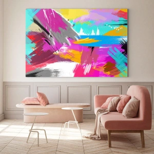 • Ausdrucksstarke Abstraktion mit dynamischen Pinselstrichen in leuchtenden Farben, perfekt für moderne und energiegeladene Innenräume.