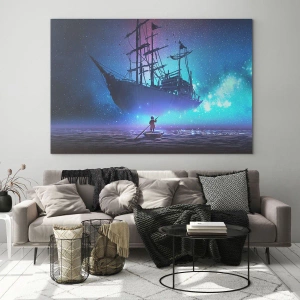 Das Bild passt perfekt in moderne und klassische Räume und verleiht ihnen einen einzigartigen Charakter. Seine subtilen Farbtöne und die harmonische Komposition machen es zur idealen Wahl für alle, die Schönheit und Inspiration schätzen. Das Motiv eines schwebenden Schiffs, umgeben von Sternen, bringt eine Atmosphäre der Träume und endlosen Möglichkeiten in das Interieur.