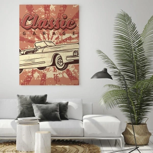 Glasbild - Bild auf glas - Retro-Grafik eines Oldtimers vor einem Strahlenhintergrund - 120x80cm - Und im Radio, Elvis - Moderne Wanddekoration für Wohnzimmer und Schlafzimmer ARTTOR