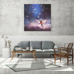 Glasbild - Bild auf glas - Eine Figur mit Engelsflügeln, die zwischen Vögeln am Himmel schwebt - 70x100cm - Du brauchst Fantasie und Mut - Moderne Wanddekoration für Wohnzimmer und Schlafzimmer ARTTOR