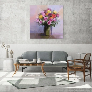 - Dieses Gemälde zeigt einen Rosenstrauß in einer Glasvase vor einem dezenten Pastellhintergrund. Eine perfekte Dekoration, um eine elegante und romantische Atmosphäre zu schaffen.