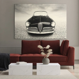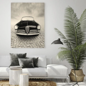 Glasbild - Bild auf glas - Oldtimer auf Kopfsteinpflasterstraße in Schwarz und Weiß - 120x80cm - Man muss mich einfach lieben - Moderne Wanddekoration für Wohnzimmer und Schlafzimmer ARTTOR