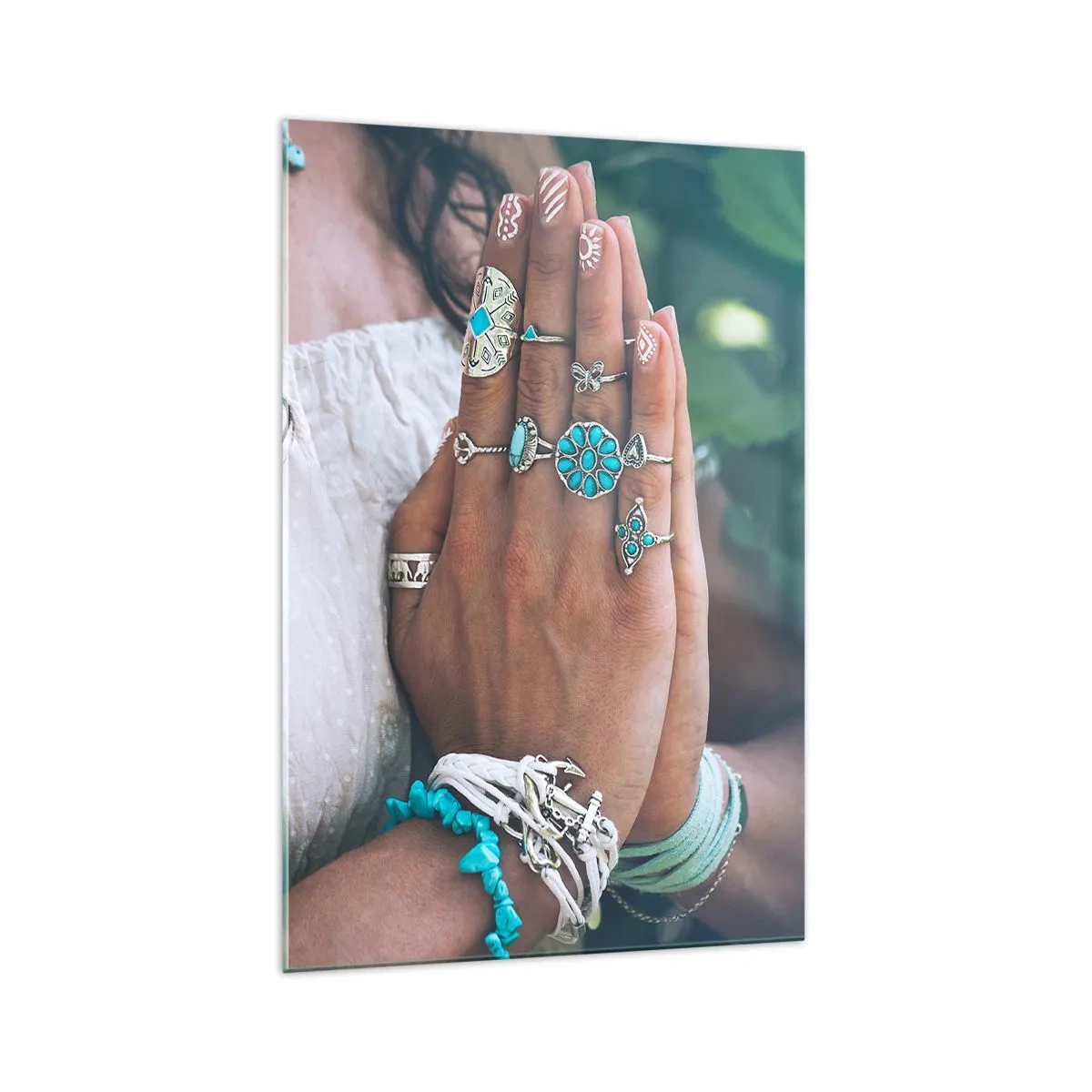 Glasbild - Bild auf glas - Mit Boho-Schmuck verzierte Hände - 70x100cm - Willkommen im Zentrum des Seins - Moderne Wanddekoration für Wohnzimmer und Schlafzimmer ARTTOR