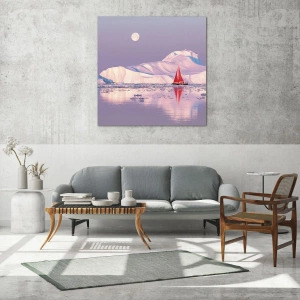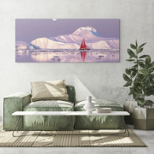 Glasbild - Bild auf glas - Ein Segelboot vor der Kulisse von Gletschern im Mondlicht - 70x50cm - Die Hitze des Segels, die Kälte des Eises - Moderne Wanddekoration für Wohnzimmer und Schlafzimmer ARTTOR