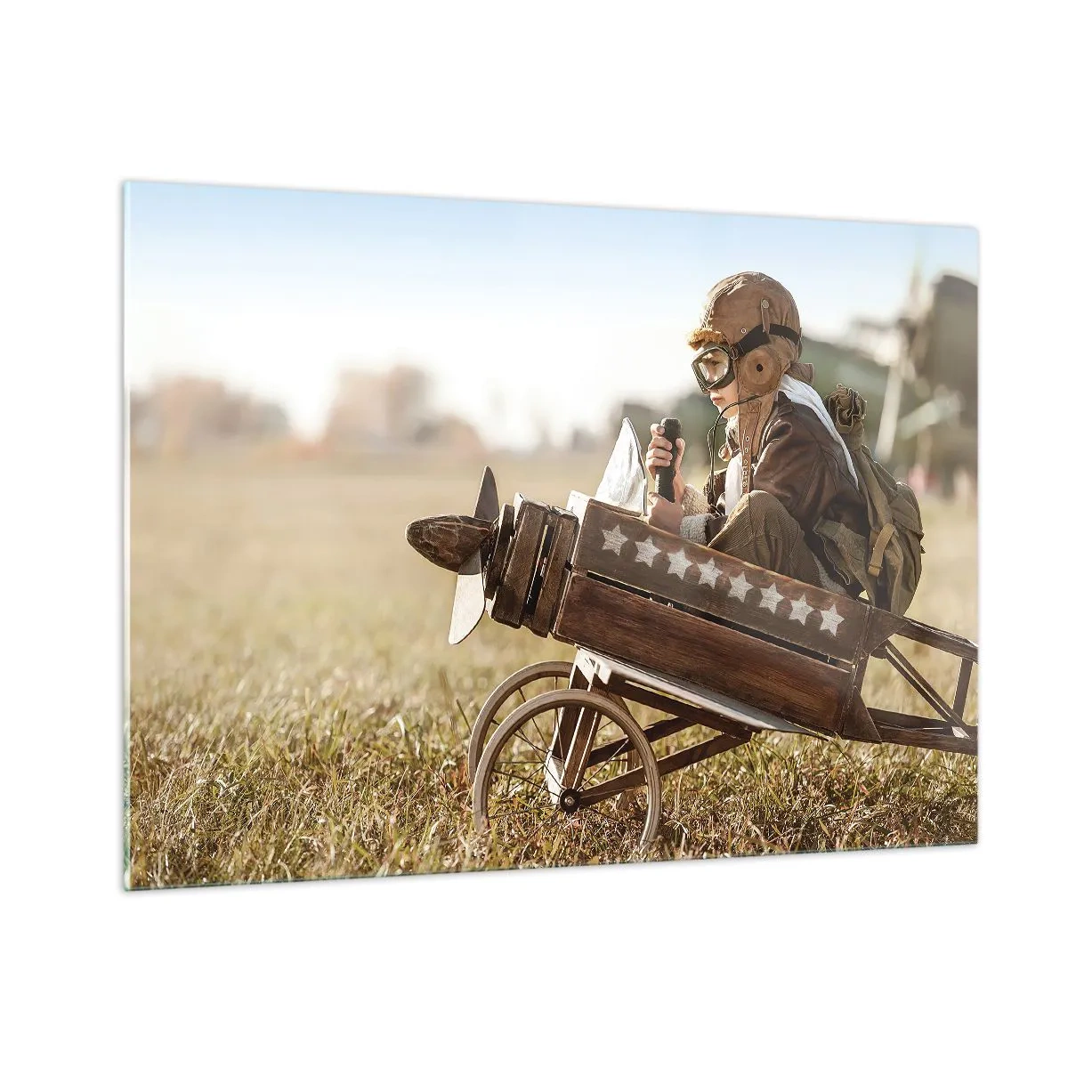Glasbild - Bild auf glas - Ein Kind in einem Holzflugzeug, das in Fliegerkleidung vorgibt, ein Pilot zu sein. - 100x70cm - Start in Richtung eines Traums - Moderne Wanddekoration für Wohnzimmer und Schlafzimmer ARTTOR