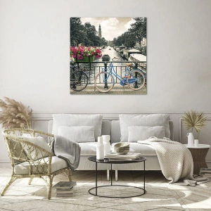 Glasbild - Bild auf glas - Bunte Fahrräder auf der Kanalbrücke - 100x70cm - Die Farben der Amsterdamer Straße - Moderne Wanddekoration für Wohnzimmer und Schlafzimmer ARTTOR