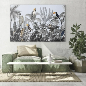 Glasbild - Bild auf glas - Exotische Tiere in einem schwarz-weißen Dschungel auf hellem Hintergrund - 50x70cm - Afrikanisches Märchen - Moderne Wanddekoration für Wohnzimmer und Schlafzimmer ARTTOR