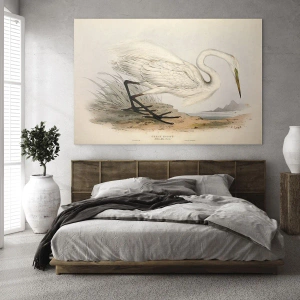 Glasbild - Bild auf glas - Vintage Illustration eines weißen Reihers am Wasserrand - 120x80cm - Dame auf den Binsen - Moderne Wanddekoration für Wohnzimmer und Schlafzimmer ARTTOR
