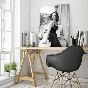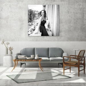 Glasbild - Bild auf glas - Eine Frau in einem schwarzen Kleid auf einem Balkon im Pariser Stil - 50x70cm - Bestimmt ein Pariser - Moderne Wanddekoration für Wohnzimmer und Schlafzimmer ARTTOR