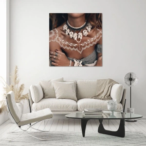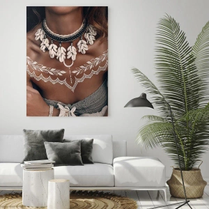 Glasbild - Bild auf glas - Boho-Style mit Muschelschmuck und Lochmuster - 120x50cm - Talismane, Rituale der Weiblichkeit - Moderne Wanddekoration für Wohnzimmer und Schlafzimmer ARTTOR