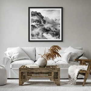 Poster in einem schwarzem Rahmen - Schwarz-Weiß-Ansicht der von Wolken umgebenen Berge - 70x50cm - Schön und grausam - Moderne Wanddekoration für Wohnzimmer und Schlafzimmer ARTTOR