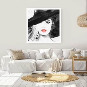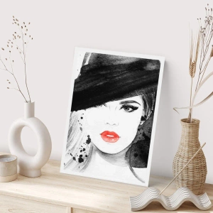 Poster - Porträt einer Frau mit Hut und rotem Lippenakzent - 50x70cm - Frau in schwarz - Moderne Wanddekoration für Wohnzimmer und Schlafzimmer ARTTOR