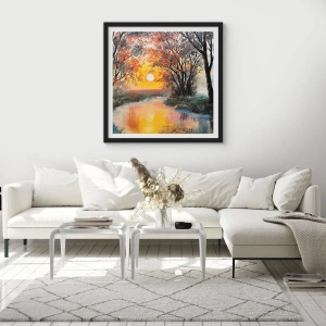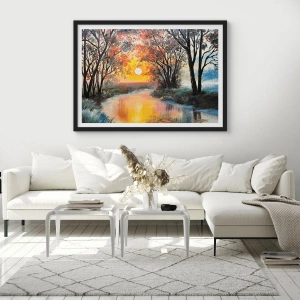 Poster in einem schwarzem Rahmen - Sonnenuntergang über dem Fluss in einer Herbstlandschaft - 100x70cm - Herbststimmung - Moderne Wanddekoration für Wohnzimmer und Schlafzimmer ARTTOR