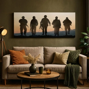 Die Dynamik dieser Komposition fängt den Charakter von Soldaten und ihre Standhaftigkeit angesichts von Herausforderungen perfekt ein. Kampfjets im Flug verleihen dem Bild eine moderne Note und passen perfekt zu militärischen und zeitgenössischen Stilen. Dieses einzigartige Kunstwerk inspiriert und motiviert und ist daher die ideale Wahl für Innenräume, die Stärke und Mut betonen.