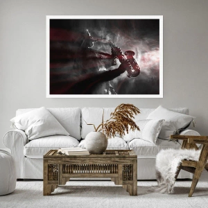 Poster - Saxophonist im Rauch auf der Bühne in stimmungsvollem Schwarz und Rot - 100x70cm - In den Dämpfen des Jazz - Moderne Wanddekoration für Wohnzimmer und Schlafzimmer ARTTOR