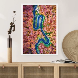 Poster - Eine kurvenreiche Straße in einem herbstlichen Wald aus der Vogelperspektive gesehen - 50x70cm - Kurvenreicher Weg durch den Wald - Moderne Wanddekoration für Wohnzimmer und Schlafzimmer ARTTOR