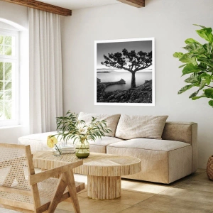 Poster - Schwarz-weiße Landschaft mit einem einsamen Baum auf einer Klippe über dem Meer - 100x70cm - Stille bis zum Horizont - Moderne Wanddekoration für Wohnzimmer und Schlafzimmer ARTTOR