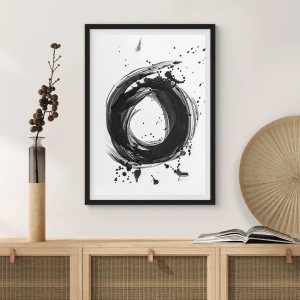 Poster in einem schwarzem Rahmen - Schwarz-weißer abstrakter Kreis mit dynamischen Punkten - 50x70cm - Der Wirbel der Schöpfung - Moderne Wanddekoration für Wohnzimmer und Schlafzimmer ARTTOR