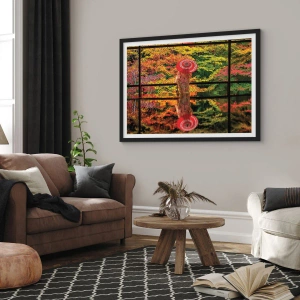 Poster in einem schwarzem Rahmen - Eine Frau im Kimono mit Regenschirm vor dem Hintergrund einer Herbstlandschaft. - 70x50cm - Im Tempel der Natur - Moderne Wanddekoration für Wohnzimmer und Schlafzimmer ARTTOR