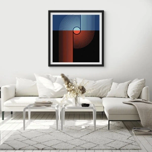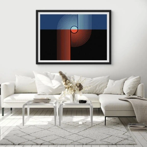 Poster in einem schwarzem Rahmen - Geometrische Komposition mit Linien in Marineblau und Orange. - 50x70cm - In einer geometrischen Umarmung - Moderne Wanddekoration für Wohnzimmer und Schlafzimmer ARTTOR