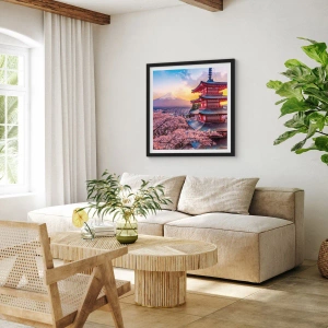 Poster in einem schwarzem Rahmen - Eine Pagode in Japan mit Kirschblüten und dem Berg Fuji - 100x70cm - Die Essenz des japanischen Geistes - Moderne Wanddekoration für Wohnzimmer und Schlafzimmer ARTTOR