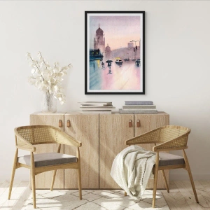 Poster in einem schwarzem Rahmen - Eine Stadtstraße in der Abenddämmerung im Aquarellstil - 70x50cm - Im regnerischen Dunst - Moderne Wanddekoration für Wohnzimmer und Schlafzimmer ARTTOR