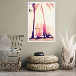 Poster - Surfbretter aufgereiht unter Palmen am Strand - 50x70cm - Es wird ein toller Tag - Moderne Wanddekoration für Wohnzimmer und Schlafzimmer ARTTOR
