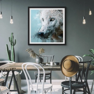 - Ein künstlerisches Porträt eines Wolfes mit auffälligen Aquarelldetails. Perfekt für Innenräume im skandinavischen oder Boho-Stil.