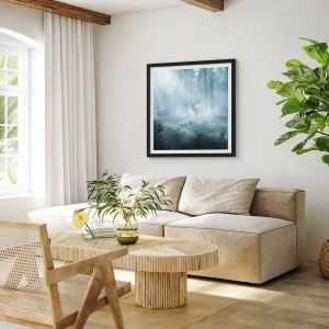 - Dieses stimmungsvolle Poster zeigt ein Reh im Morgennebel eines Waldes. Es passt perfekt in eine Einrichtung im skandinavischen Stil und bringt Ruhe und Harmonie.