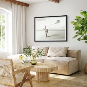 Poster in einem schwarzem Rahmen - Eine minimalistische Holzhand mit einem Drachen vor einem Landschaftshintergrund. - 70x50cm - Kraftprobe - Moderne Wanddekoration für Wohnzimmer und Schlafzimmer ARTTOR