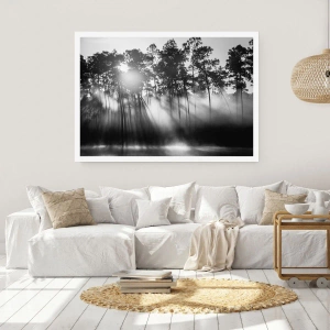 Poster - Schwarz-weißer Wald im Morgennebel - 100x70cm - Unaufhaltsame Sonne - Moderne Wanddekoration für Wohnzimmer und Schlafzimmer ARTTOR