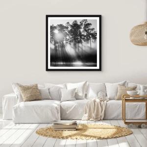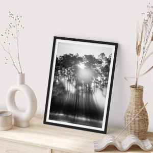 • Dieses Poster zeigt eine schwarz-weiße Waldszene mit Sonnenstrahlen, die durch den Nebel scheinen. Eine stimmungsvolle Dekoration, die jedem Interieur Eleganz und Ruhe verleiht.