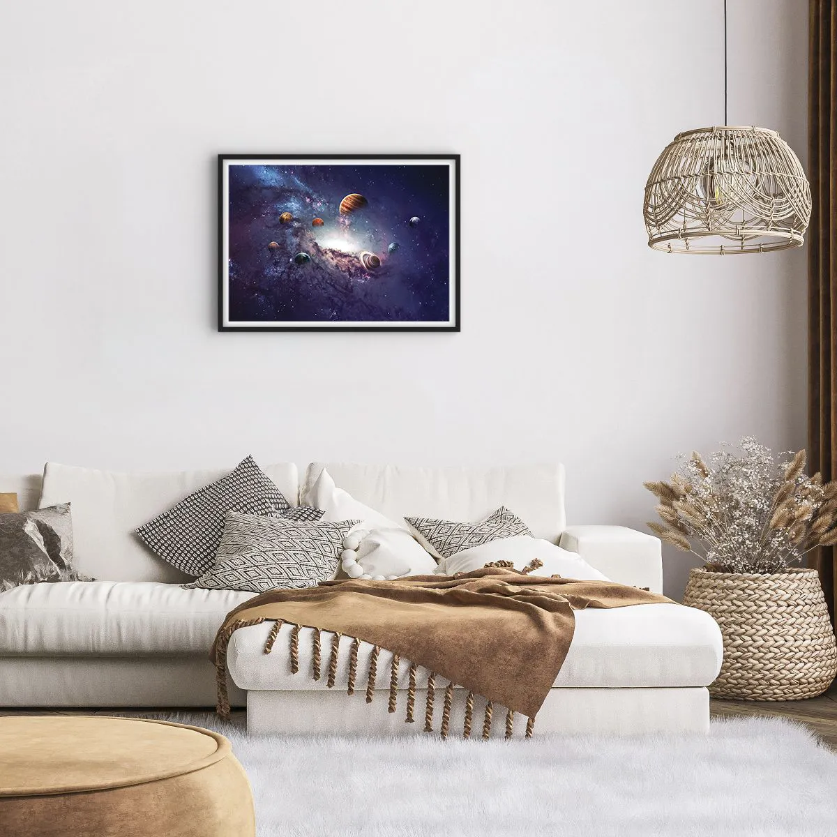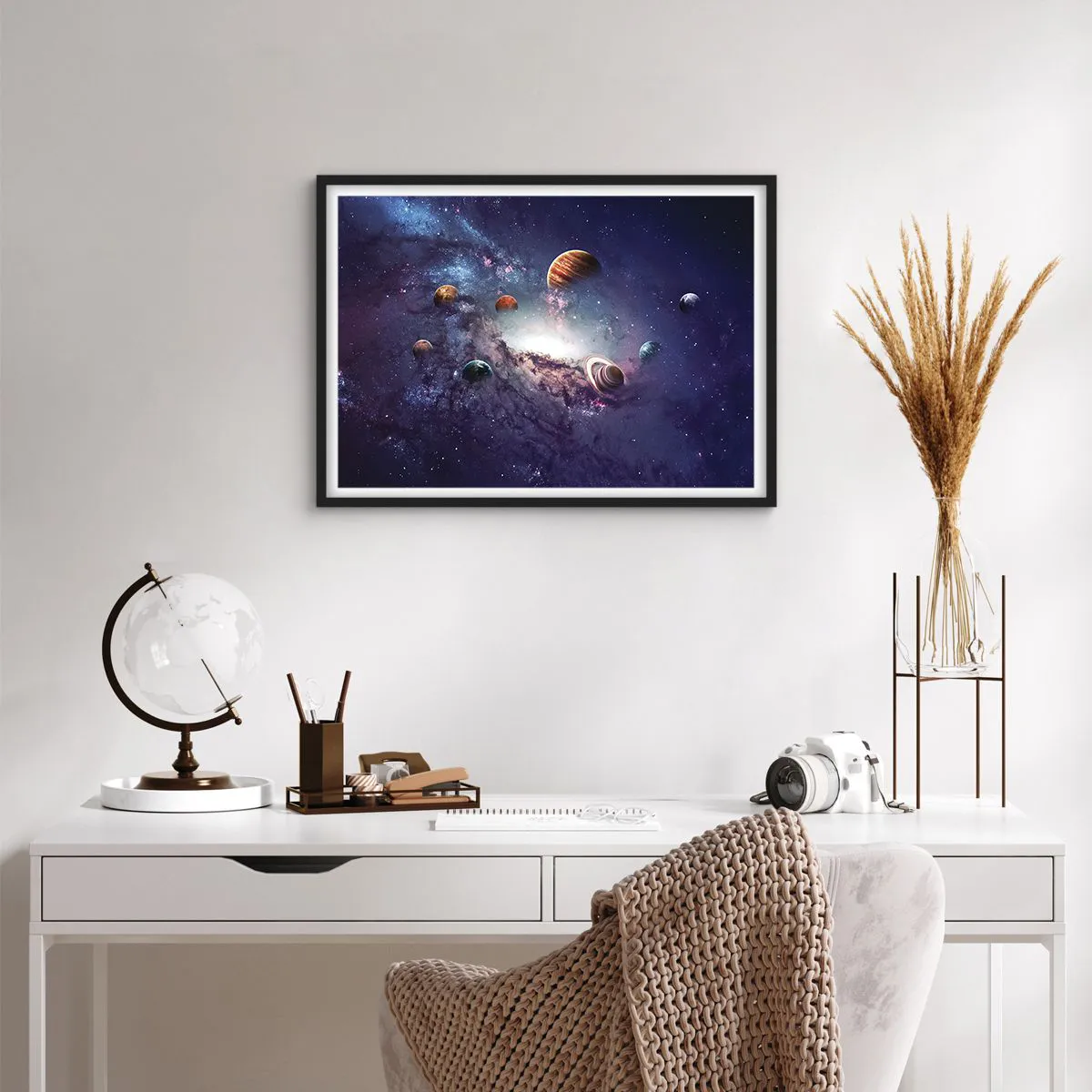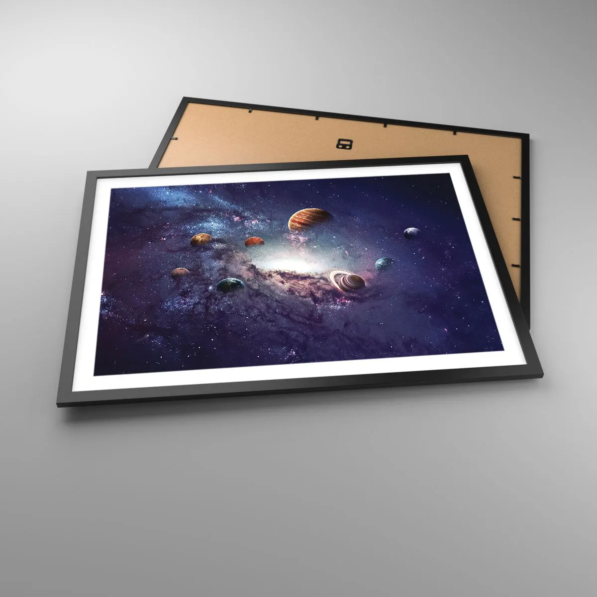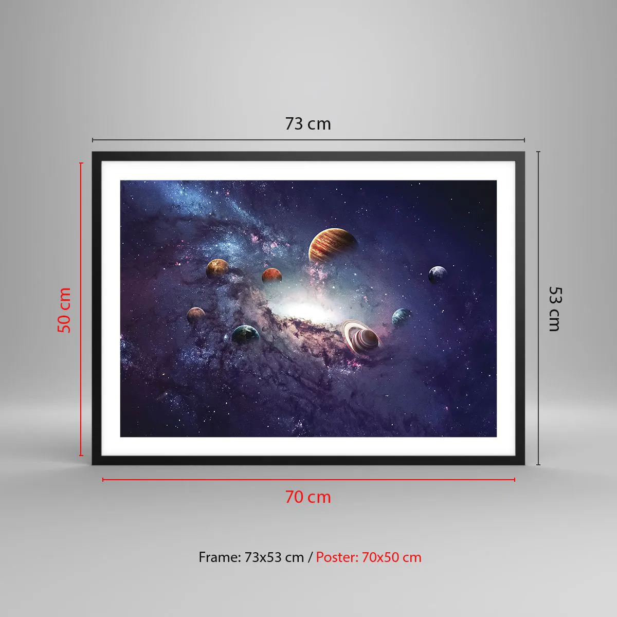 Poster in einem schwarzem Rahmen - Planeten in einer Galaxie mit einem Nebel im Hintergrund - 70x50cm - Solar-Tanz-System - Moderne Wanddekoration für Wohnzimmer und Schlafzimmer ARTTOR