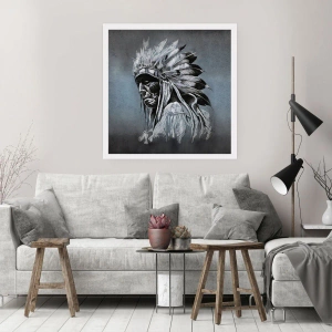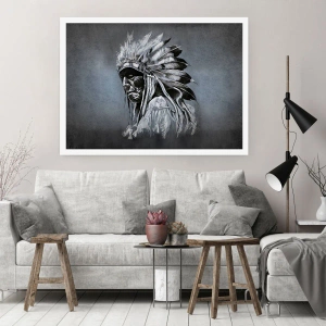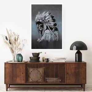 Poster - Porträt eines Indianerhäuptlings mit Federschmuck vor grauem Hintergrund - 50x70cm - Zurück zu den Wurzeln - Moderne Wanddekoration für Wohnzimmer und Schlafzimmer ARTTOR