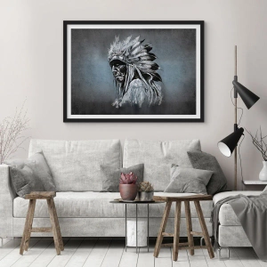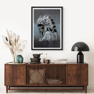 - Dieses Poster zeigt das Porträt eines Indianerhäuptlings mit Federkopfschmuck vor grauem Hintergrund. Perfekt für Innenräume, die Eleganz mit historischen Motiven verbinden.