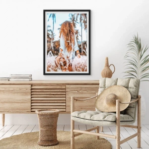 - Das Poster zeigt eine Frau in weißem Hemd, die zwischen Palmen spazieren geht. Ihr langes, welliges Haar und ihre sommerliche Ausstrahlung verleihen der Szene einen unbeschwerten, exotischen Charme. Eine perfekte Dekoration für einen Boho- und Tropenstil.