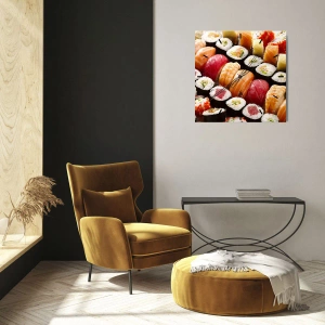 - Eine Nahaufnahme einer Vielzahl von buntem Sushi, das durch seine Ästhetik die Aufmerksamkeit auf sich zieht. Eine perfekte Wanduhr für Küche, Esszimmer oder Restaurant.