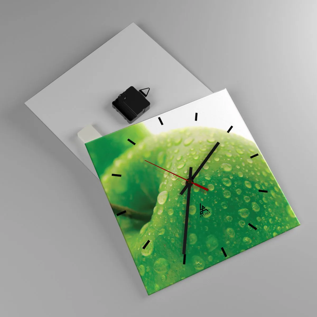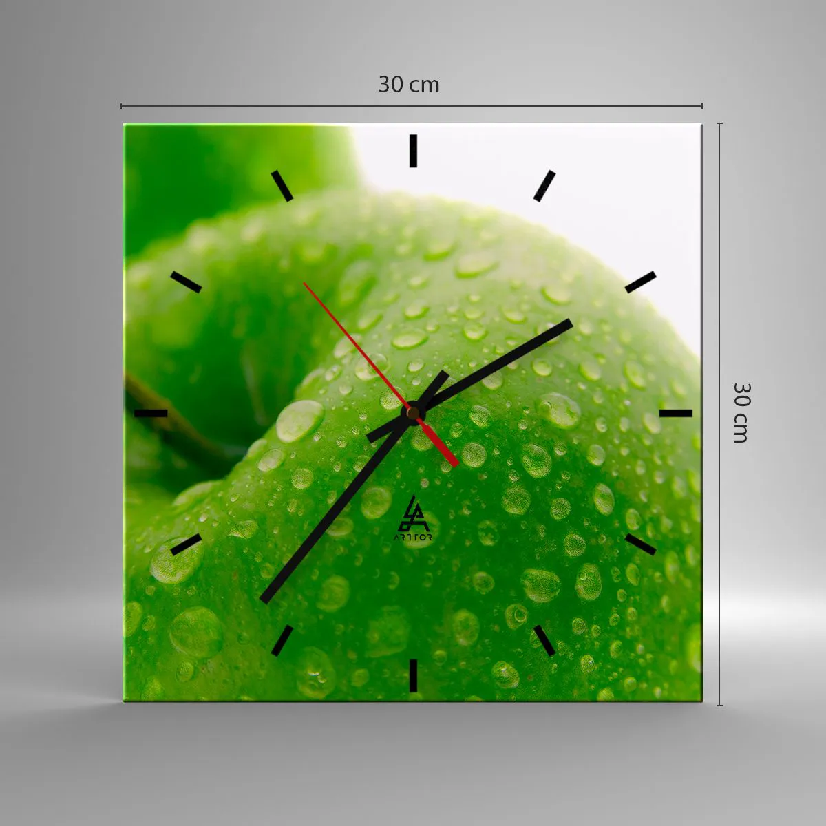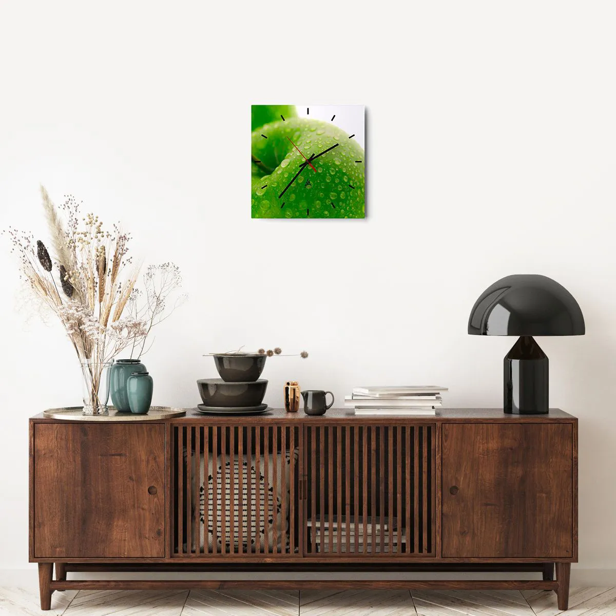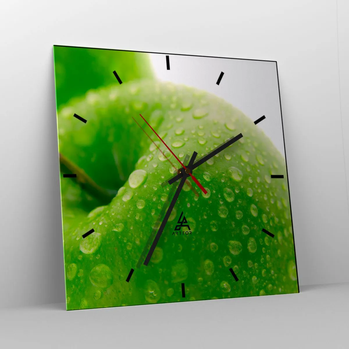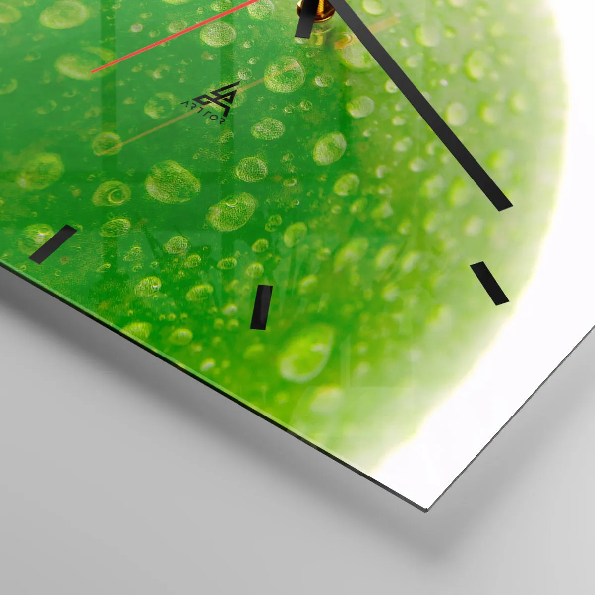 Wanduhr - Glasuhr - Nahaufnahme eines grünen Apfels mit Wassertropfen - 30x30cm - Grüne kühle Frische - Moderne Wanddekoration für Wohnzimmer und Schlafzimmer ARTTOR