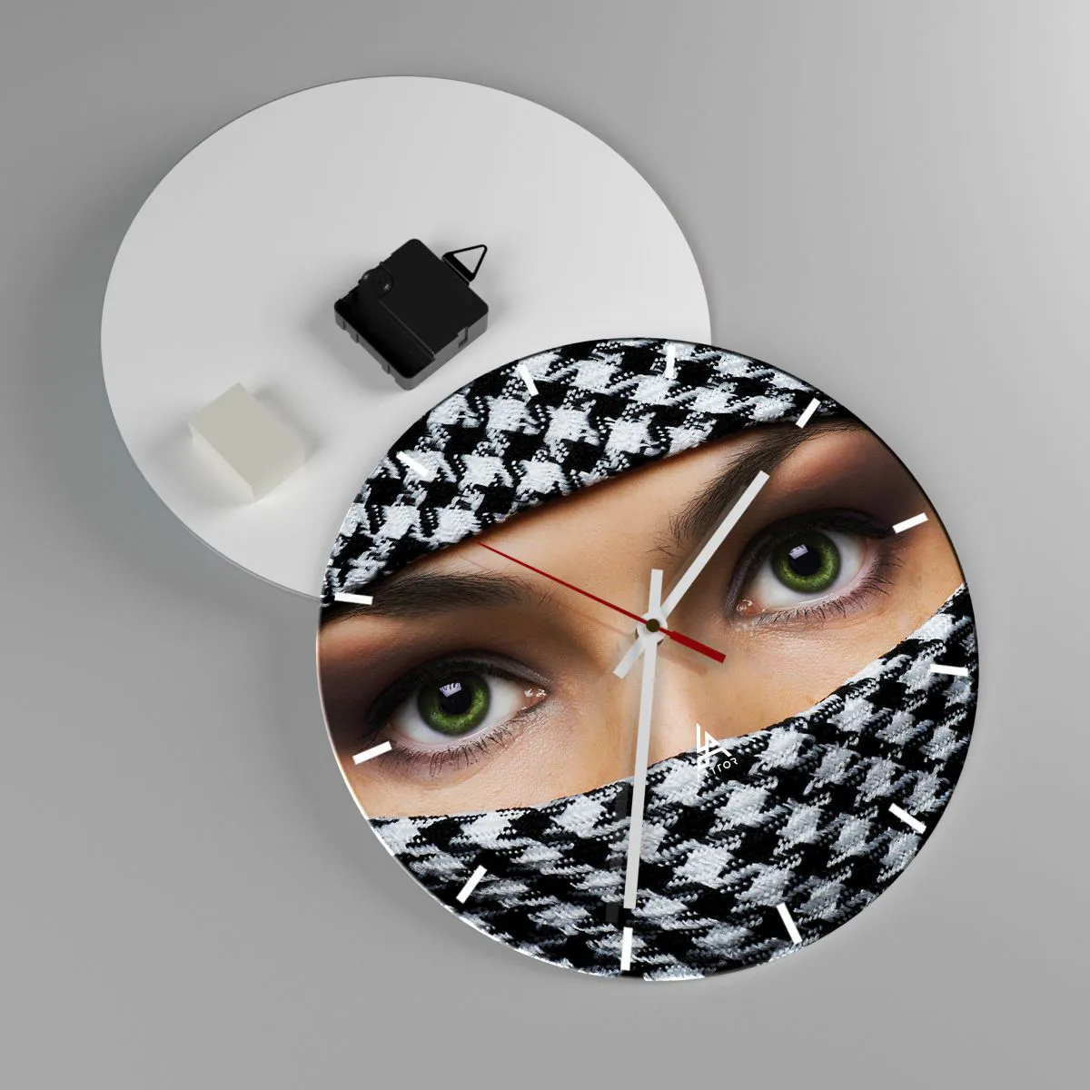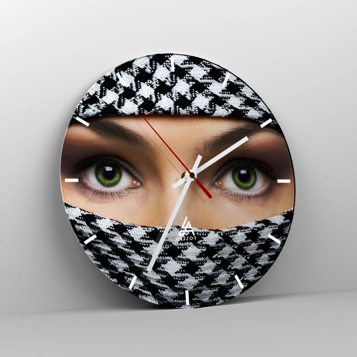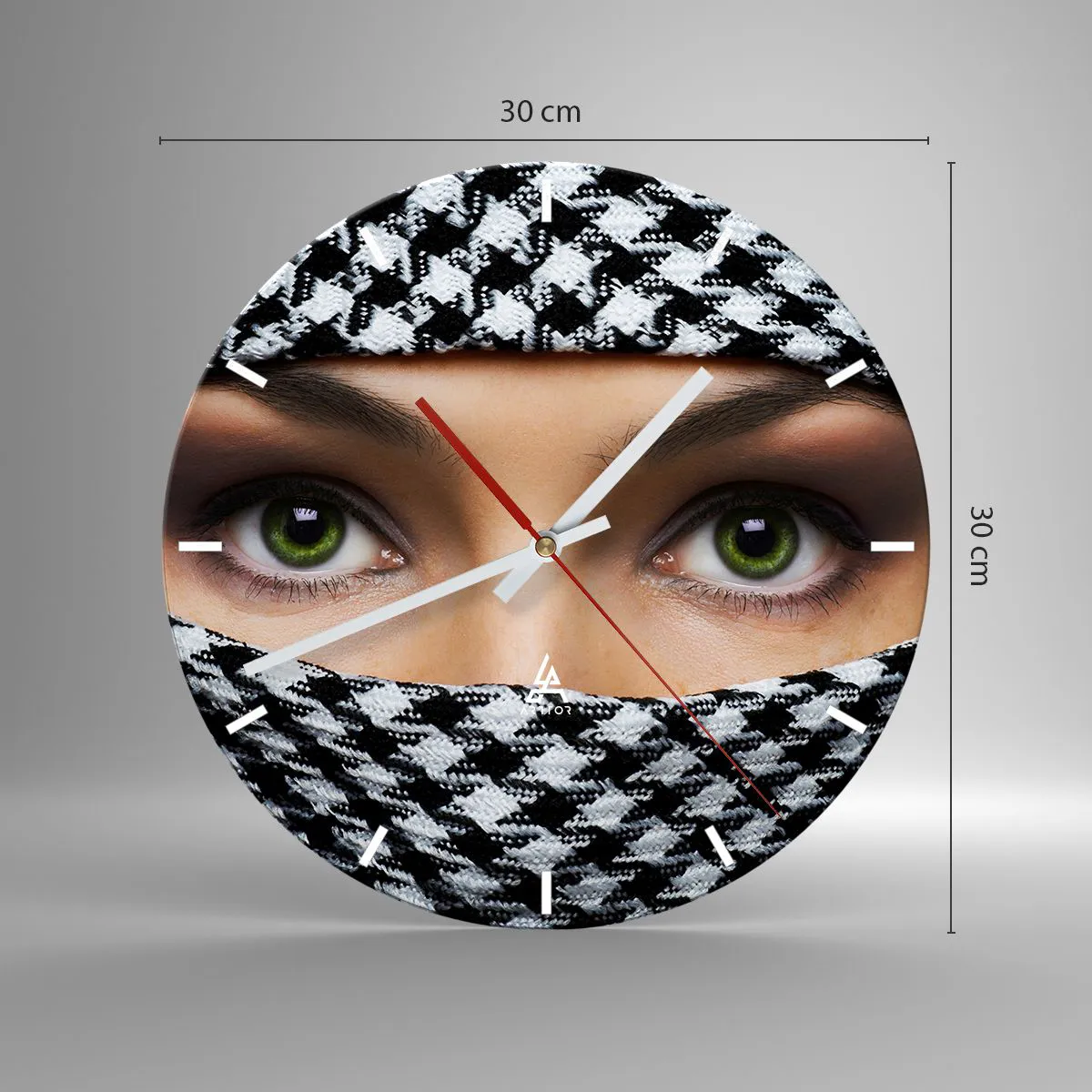 Wanduhr - Glasuhr - Grüne Augen versteckt hinter einem schwarz-weißen Stoffmuster - 30x30cm - Ein Porträt einer verschleierten grünäugigen Schönheit - Moderne Wanddekoration für Wohnzimmer, Küche und Schlafzimmer ARTTOR