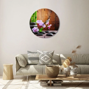 Wanduhr - Glasuhr - Bambus, Steine und rosa Orchideen im Zen-Stil auf Holzhintergrund - 30x30cm - Treffen Sie die Freuden des Ostens - Moderne Wanddekoration für Wohnzimmer und Schlafzimmer ARTTOR