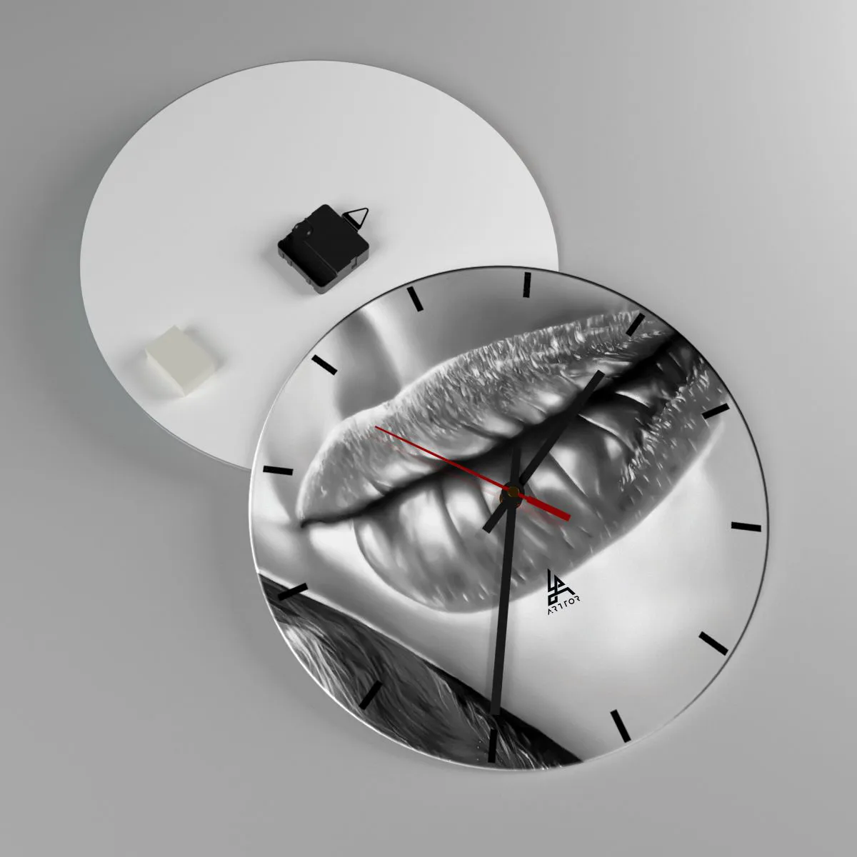 Die Uhr besteht aus 4 mm dickem Sicherheitsglas Glas. Die Herstellungstechnologie der Uhr entspricht der Sicherheitsklasse 2B2 gemäß der Norm PN-EN 12600: 2004, die Stoßfestigkeit garantiert. Die Uhr auf dem Glas ist bereit zu hängen - es hat einen Metallanhänger, einen Anhänger auf der Rückseite der Uhr und einen Schaumstoffabstand, der einen gleichmäßigen Abstand zwischen der Uhr und der Wand reguliert. Die Uhr hat einen geräuschlosen Schwimmmechanismus, der von einer 1,5-V-Batterie betrieben wird - AA-Batterie inbegriffen).