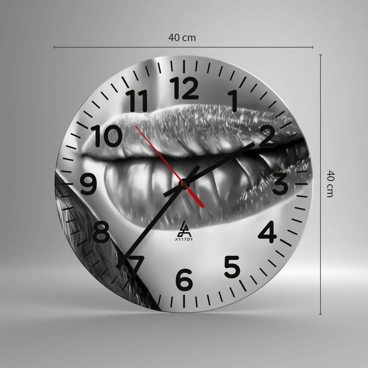 Die Uhr besteht aus 4 mm dickem Sicherheitsglas Glas. Die Herstellungstechnologie der Uhr entspricht der Sicherheitsklasse 2B2 gemäß der Norm PN-EN 12600: 2004, die Stoßfestigkeit garantiert. Die Uhr auf dem Glas ist bereit zu hängen - es hat einen Metallanhänger, einen Anhänger auf der Rückseite der Uhr und einen Schaumstoffabstand, der einen gleichmäßigen Abstand zwischen der Uhr und der Wand reguliert. Die Uhr hat einen geräuschlosen Schwimmmechanismus, der von einer 1,5-V-Batterie betrieben wird - AA-Batterie inbegriffen).
