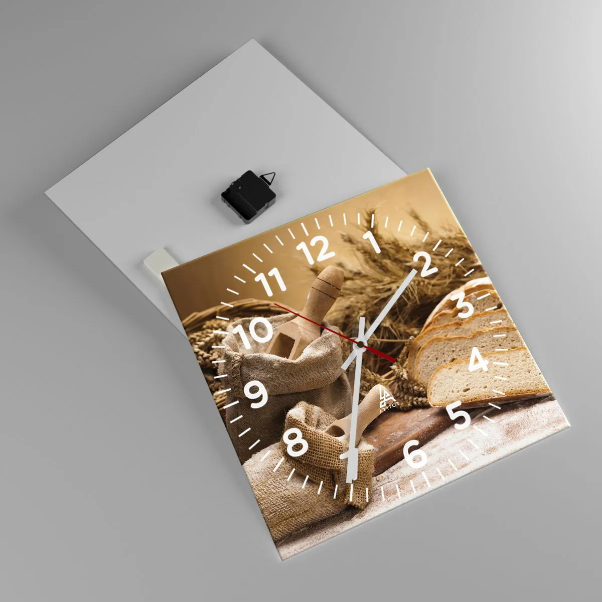 Die Uhr besteht aus 4 mm dickem Sicherheitsglas Glas. Die Herstellungstechnologie der Uhr entspricht der Sicherheitsklasse 2B2 gemäß der Norm PN-EN 12600: 2004, die Stoßfestigkeit garantiert. Die Uhr auf dem Glas ist bereit zu hängen - es hat einen Metallanhänger, einen Anhänger auf der Rückseite der Uhr und einen Schaumstoffabstand, der einen gleichmäßigen Abstand zwischen der Uhr und der Wand reguliert. Die Uhr hat einen geräuschlosen Schwimmmechanismus, der von einer 1,5-V-Batterie betrieben wird - AA-Batterie inbegriffen).