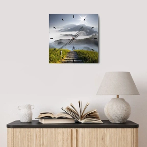 Wanduhr - Glasuhr - Steintreppen führen durch die in Morgennebel gehüllten Berge - 30x30cm - Immer noch den Wolken entgegen - Moderne Wanddekoration für Wohnzimmer und Schlafzimmer ARTTOR