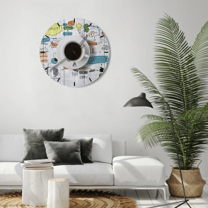 Die Wanduhr "Zeit für eine Pause" ist die perfekte Wahl für alle, die Inspiration und Kreativität in ihrem Berufsalltag schätzen. Das Zifferblatt zeigt eine Tasse aromatischen Kaffee vor dem Hintergrund eines Businessplans voller Diagramme, Notizen und Zeichnungen, die Strategie und Ideen symbolisieren. Diese Komposition fängt perfekt den Geist von Büroarbeit und kreativen Prozessen ein und schafft gleichzeitig eine Atmosphäre der Motivation und Entspannung.