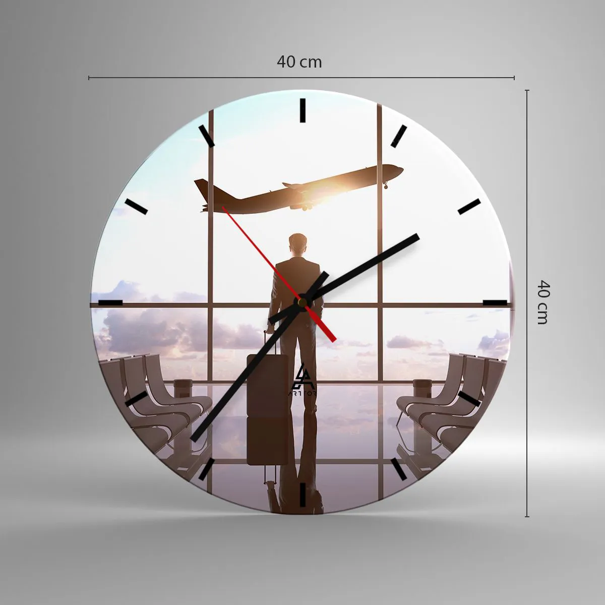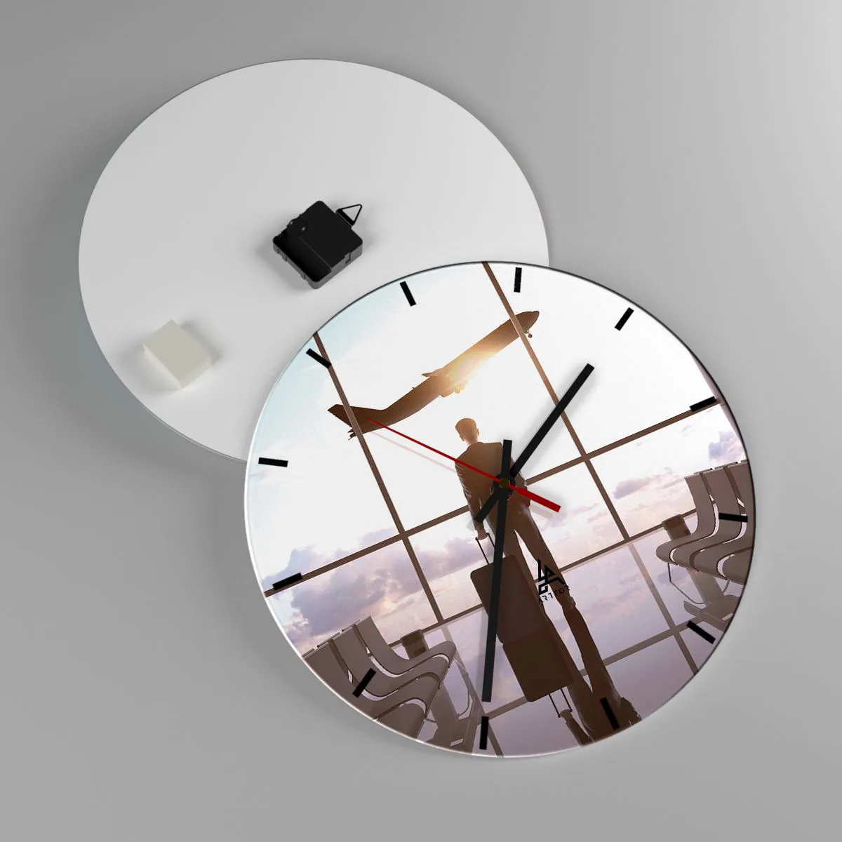 Die Uhr besteht aus 4 mm dickem Sicherheitsglas Glas. Die Herstellungstechnologie der Uhr entspricht der Sicherheitsklasse 2B2 gemäß der Norm PN-EN 12600: 2004, die Stoßfestigkeit garantiert. Die Uhr auf dem Glas ist bereit zu hängen - es hat einen Metallanhänger, einen Anhänger auf der Rückseite der Uhr und einen Schaumstoffabstand, der einen gleichmäßigen Abstand zwischen der Uhr und der Wand reguliert. Die Uhr hat einen geräuschlosen Schwimmmechanismus, der von einer 1,5-V-Batterie betrieben wird - AA-Batterie inbegriffen).