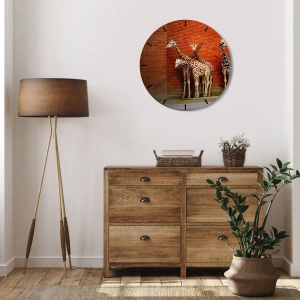 - Diese einzigartige Wanduhr zeigt eine Gruppe Giraffen, die vor einer Ziegelwand stehen. Eine originelle Dekoration, die jedem Interieur eine exotische Atmosphäre verleiht.