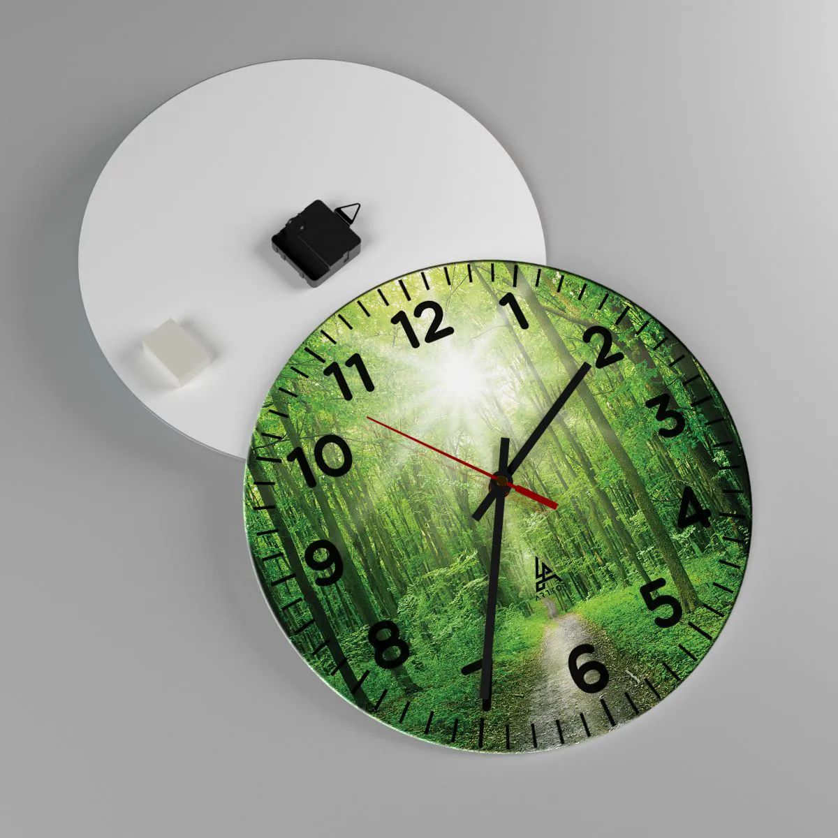 Die Uhr besteht aus 4 mm dickem Sicherheitsglas Glas. Die Herstellungstechnologie der Uhr entspricht der Sicherheitsklasse 2B2 gemäß der Norm PN-EN 12600: 2004, die Stoßfestigkeit garantiert. Die Uhr auf dem Glas ist bereit zu hängen - es hat einen Metallanhänger, einen Anhänger auf der Rückseite der Uhr und einen Schaumstoffabstand, der einen gleichmäßigen Abstand zwischen der Uhr und der Wand reguliert. Die Uhr hat einen geräuschlosen Schwimmmechanismus, der von einer 1,5-V-Batterie betrieben wird - AA-Batterie inbegriffen).