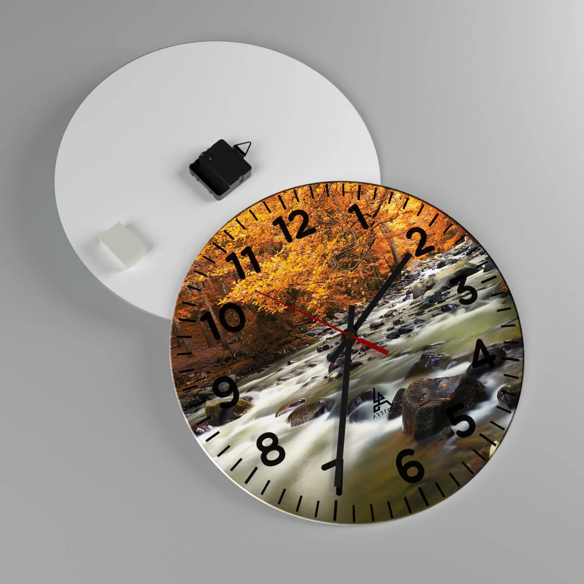 Die Uhr besteht aus 4 mm dickem Sicherheitsglas Glas. Die Herstellungstechnologie der Uhr entspricht der Sicherheitsklasse 2B2 gemäß der Norm PN-EN 12600: 2004, die Stoßfestigkeit garantiert. Die Uhr auf dem Glas ist bereit zu hängen - es hat einen Metallanhänger, einen Anhänger auf der Rückseite der Uhr und einen Schaumstoffabstand, der einen gleichmäßigen Abstand zwischen der Uhr und der Wand reguliert. Die Uhr hat einen geräuschlosen Schwimmmechanismus, der von einer 1,5-V-Batterie betrieben wird - AA-Batterie inbegriffen).