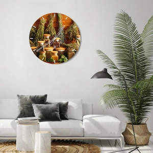 Wanduhr - Glasuhr - Kräuter und Gewürze in Gläsern auf rustikalem Hintergrund - 30x30cm - Küchenzauber - Moderne Wanddekoration für Wohnzimmer und Schlafzimmer ARTTOR